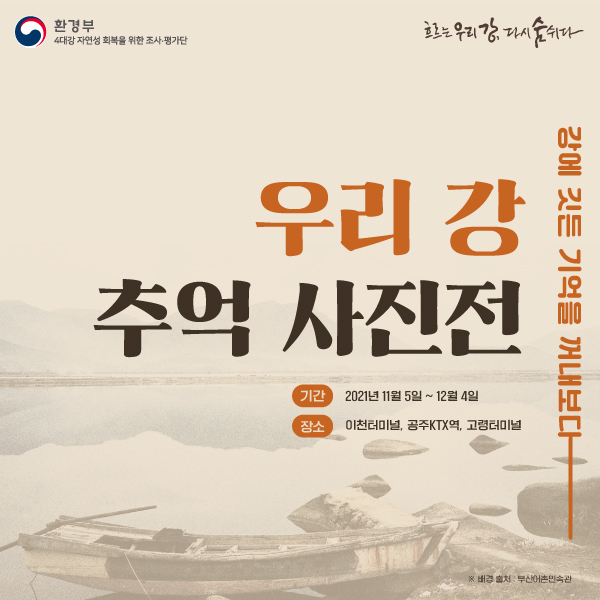 [충청뉴스큐] 환경부는 오는 11월 5일부터 12월 4일까지 한강, 낙동강, 금강의 옛 모습과 지역주민의 삶 및 문화를 담은 ‘우리 강 추억 사진전’을 이천·고령 버스터미널과 공주역 대합실에서 개최한다.