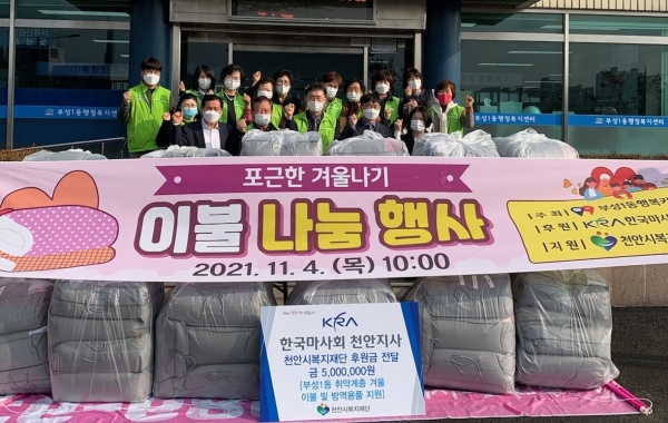 한익희 부성1동은 “매년 부성1동 취약계층을 위해 아낌없이 후원해주는 한국마사회 천안지사에 진심으로 감사드린다”며 “코로나19 장기화로 인해 어려운 상황을 맞고 있는 분들이 추운 겨울 따뜻하게 보내시길 바란다”고 답했다.