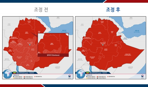 이번 조정은 에티오피아 내 내전 상황이 악화됨에 따라 우리 국민에 대한 안전 우려가 커지고 있음을 감안한 것이다.