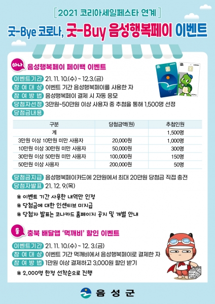 8일 군에 따르면, 11월 단계적 일상 회복과 2021년 코리아세일페스타 기간에 맞춰 ‘굿-Bye 코로나 굿-Buy 음성행복페이’ 특별 이벤트를 추진한다고 밝혔다.