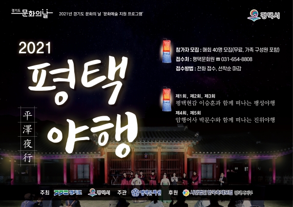 한편 ‘2021년 경기도 문화의 날 문화예술지원프로그램’의 일환으로 진행되는 ‘평택야행’은 경기도와 평택시가 주최하고 평택문화원이 주관하며 사단법인한국축제포럼 평택시지부의 후원으로 진행된다.