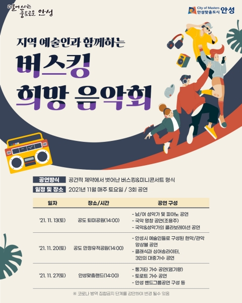 일상회복의 염원이 담긴 음악회는 11월 13일부터 27일까지, 매주 토요일 안성 관내에서 진행된다.