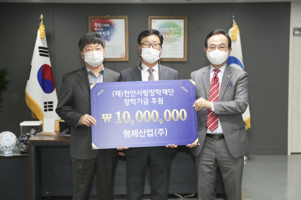 [충청뉴스큐] 형제산업 주식회사는 지난 8일 오전 천안시청을 방문해 천안의 인재 육성 및 어려운 학생을 위한 장학기금 1000만원을 재단법인 천안사랑장학재단에 전달했다.