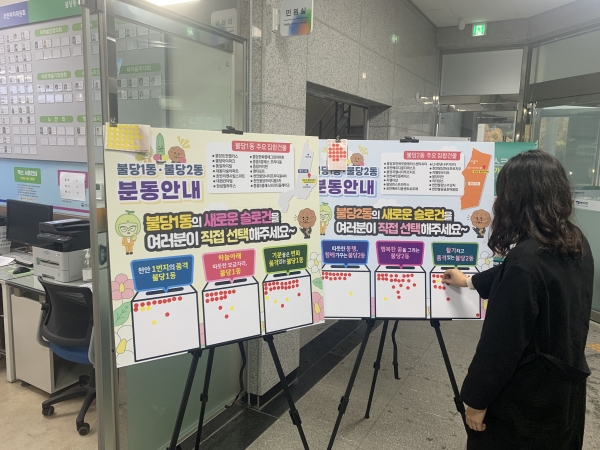 [충청뉴스큐] 천안시 불당동이 오는 15일자로 불당1·2동으로 분동됨에 따라 새로운 슬로건을 주민스스로 결정할 수 있도록 11월 1일부터 14일까지 2주간 패널을 제작해 투표를 진행 중이다.