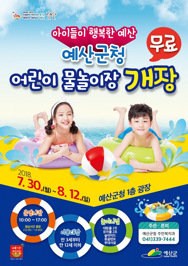 [충청뉴스큐]예산군은 오는 30일부터 8월 12일까지 14일간 예산군청 천백년 광장에서 어린이 물놀이장을 무료로 운영한다고 24일 밝혔다.