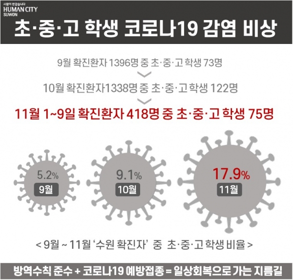 9월 수원시 코로나19 확진자 1396명 중 초·중·고등학생은 73명이었는데, 10월 확진자 1338명 중 초·중·고등학생은 122명으로 증가했다.