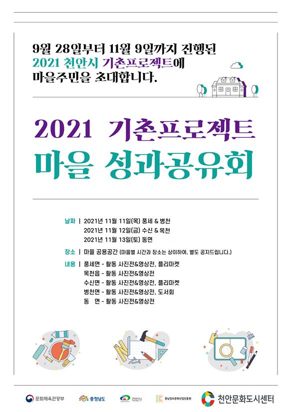 [충청뉴스큐] 천안시와 충남정보문화산업진흥원, 천안문화도시센터는 ‘2021 천안시 기촌프로젝트’ 참여 주민들을 대상으로 오는 11일부터 13일까지 순차적으로 각 마을 공용공간에서 성과공유회를 개최한다고 밝혔다.
