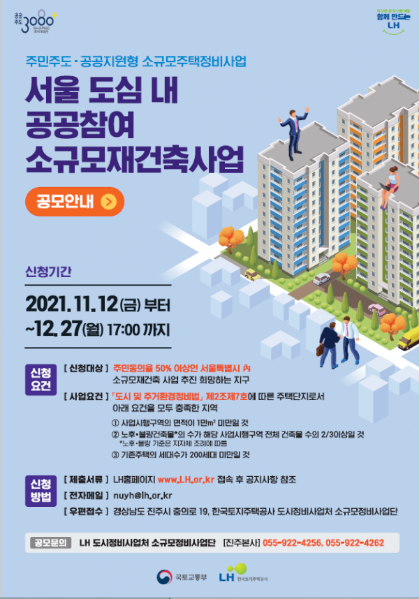 [충청뉴스큐] 국토교통부는 3080+ 대책 등을 통해 추진 중인 소규모재건축사업의 공공성을 강화하고 주민 참여를 늘릴 수 있도록 한국토지주택공사와 함께 서울지역 대상 ‘공공참여 소규모재건축사업 공모’를 11월 12일부터 12월 27일까지 시행한다.