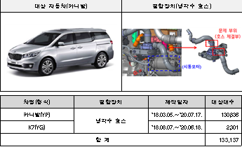 첫째, 기아㈜에서 제작, 판매한 카니발 등 2개 차종 133,137대는 보조 냉각수 펌프의 호스 체결부 설계 미흡에 따른 냉각수 누수로 시동모터가 합선되어 화재가 발생할 가능성이 확인되어 자발적으로 시정조치에 들어간다.