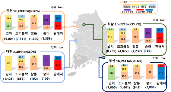 경남 통영산은 인천 연안부두시장과 하남시장, 부산 민락시장에서 75.6%가 유통되며 전남 여수산은 인천 연안부두시장과 하남시장, 부산 민락시장에서 88.6%가 유통됐다.