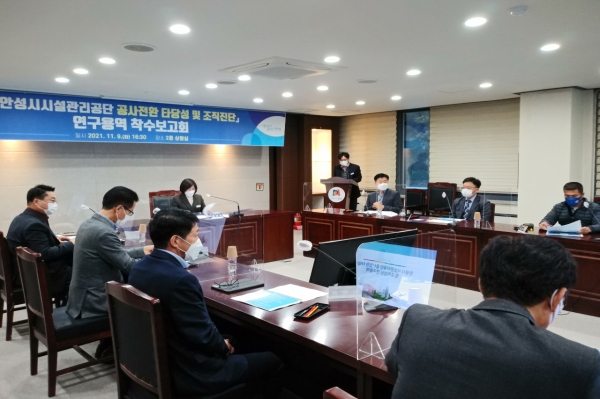이날 보고회에는 김보라 안성시장을 비롯해 용역사인 한국경제조사연구원 연구진, 시설관리공단 사측 및 노측 대표, 시 국장 및 유관부서 과장 등 20여명이 참석했으며 한국경제조사연구원 성열웅 책임연구원의 착수보고에 이은 질의응답 시간에는 신규사업 발굴, 조직 승계, 조직 전문역량 강화 방안을 포함한 공사 전환의 추진 및 조직설계 방향에 대해 심도있는 토론을 진행했다.