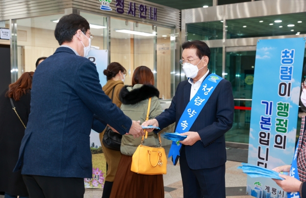 [충청뉴스큐] 계룡시는 지난 10일 시청 현관에서 퇴근시간대를 활용해 소속 직원의 청렴문화 확산을 위한 ‘청렴·소통 캠페인’을 실시했다고 밝혔다.