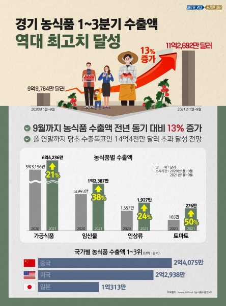 [충청뉴스큐] 경기도 농식품 수출액이 올해 3분기까지 11억2,692만 달러를 기록하며 전년 같은 기간 대비 13% 증가한 것으로 나타났다.
