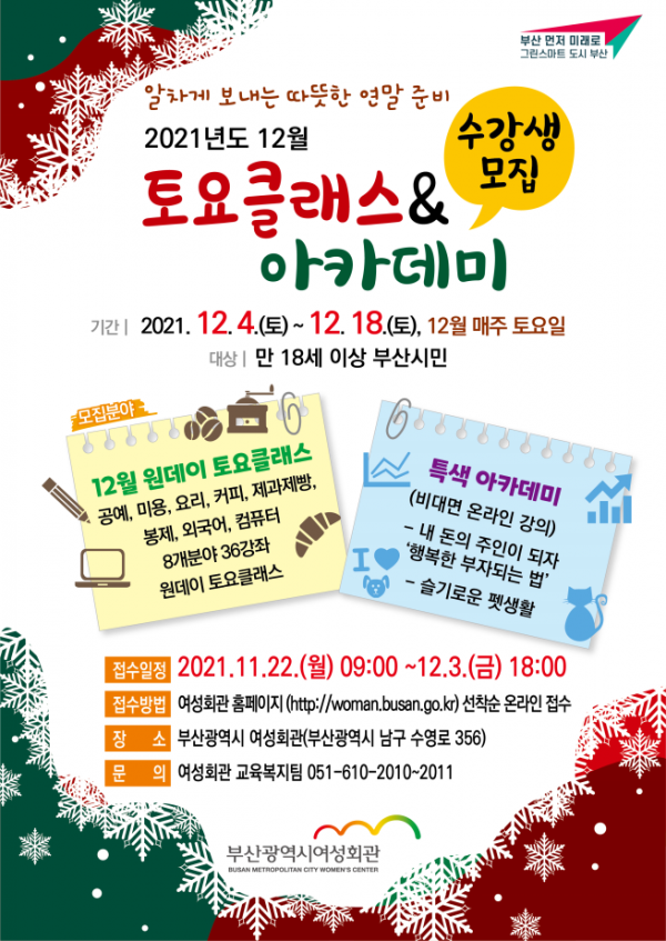 [충청뉴스큐] 부산시 여성회관은 오는 11월 22일부터 만 18세 이상의 부산시민을 대상으로 ‘12월 토요클래스와 아카데미 교육’ 수강생을 모집한다고 밝혔다.