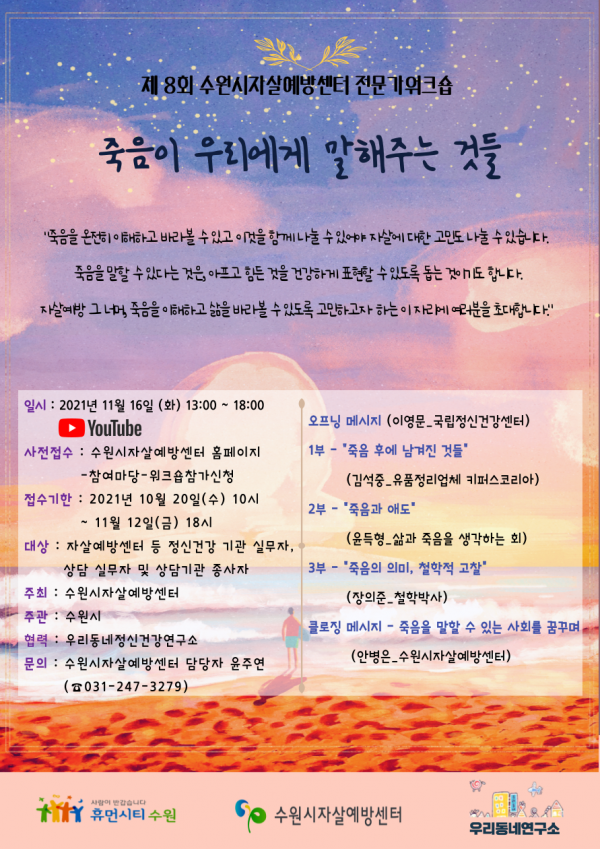 [충청뉴스큐] 자살예방법과 건강한 삶에 대해 알아보는 ‘제8회 수원시자살예방센터 전문가 워크숍’이 오는 16일 오후 1시 비대면 방식으로 열린다.