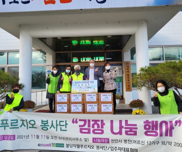 푸르지오 봉사단은 천안 불당지웰푸르지오아파트 입주민들이 지역사회 나눔을 위해 결성한 봉사단으로 매년 어려운 이웃을 위해 김장김치 나눔 봉사를 실천하고 있다.