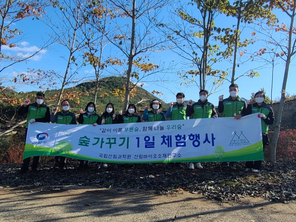 [충청뉴스큐] 산림청 국립산림과학원 산림바이오소재연구소는 숲가꾸기 기간을 맞이해 11월 11일 월아연구시험림 신나무 조림지에서 산림청 직원과 함께 ‘숲가꾸기 1일 체험행사’를 실시했다고 밝혔다.
