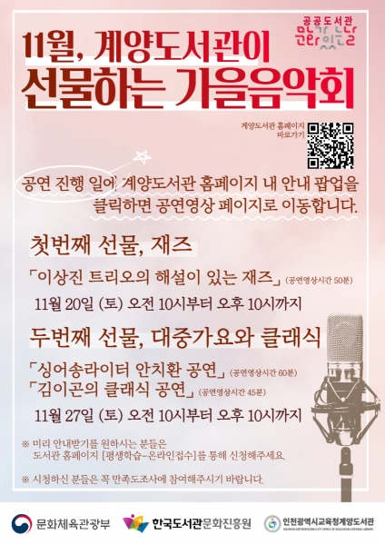[충청뉴스큐] 인천광역시교육청계양도서관은 문화체육관광부가 주최하고 한국도서관문화진흥원이 주관하는 ‘2021년 ‘공공도서관 문화가 있는 날’’ 시행 공공도서관에 선정돼 온라인 공연을 운영한다.