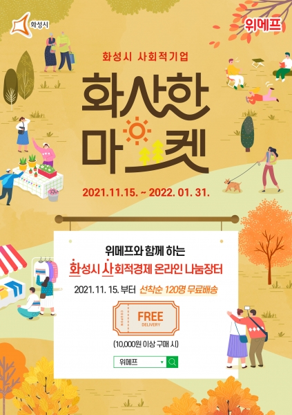 화성시 사회적경제 온라인나눔장터 화사한 마켓은 15일부터 내년 1월 말까지 위메프 상생마켓 코너에서 운영되며 건강식품, 간식, 생활용품 등 총 15개 기업의 30여 종의 제품이 판매될 예정이다.