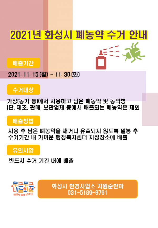 원용식 환경사업소장은 “시민들이 안심하고 생활할 수 있도록 폐농약 수거에 최선을 다하겠다”고 말했다.