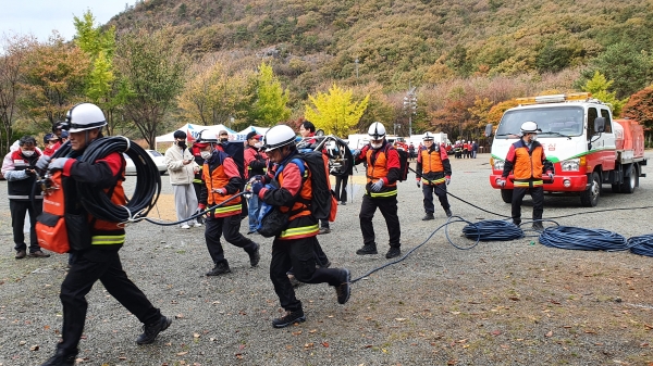 경연은 공무원 1명과 진화대원 8명이 한 팀을 이뤄 진화용수 100ℓ를 빨리 담수하는 것으로 기량을 겨뤘다.