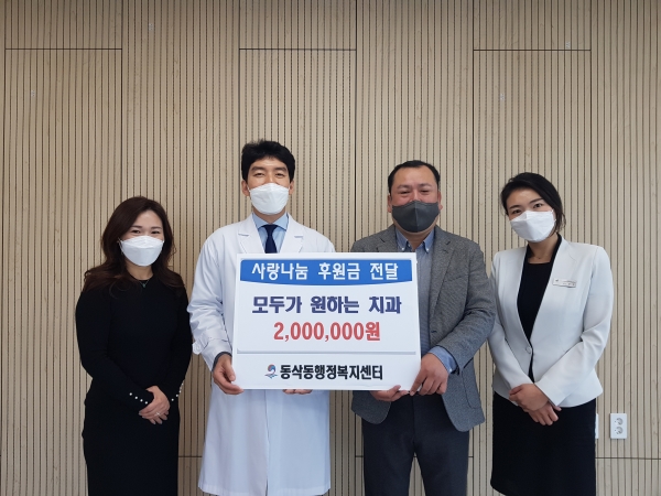 [충청뉴스큐] 평택시 비전동에 소재한 모두가 원하는 치과가 12일 동삭동행정복지센터에 저소득층을 위한 후원금 200만원을 전달했다.