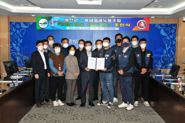 [충청뉴스큐] 예산군과 군 공무직 근로자로 구성된 충청남도공공노동조합은 지난 11일 군청 중회의실에서 ‘충남공공노조와의 임금협약 조인식’을 개최했다.