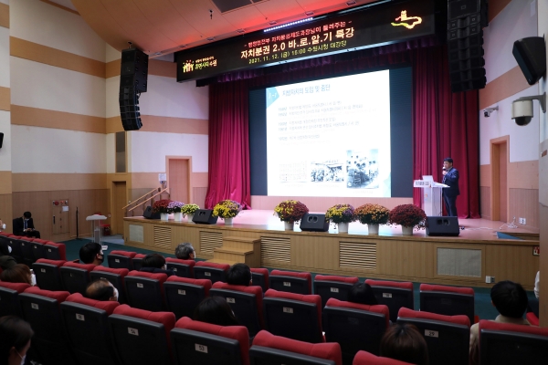 [충청뉴스큐] 수원시는 12일 시청 대강당에서 ‘자치분권 2.0 바로알기’ 특강을 열고 공직자와 시민들에게 지방자치법 전면개정에 따라 달라지는 자치분권 제도를 알렸다.