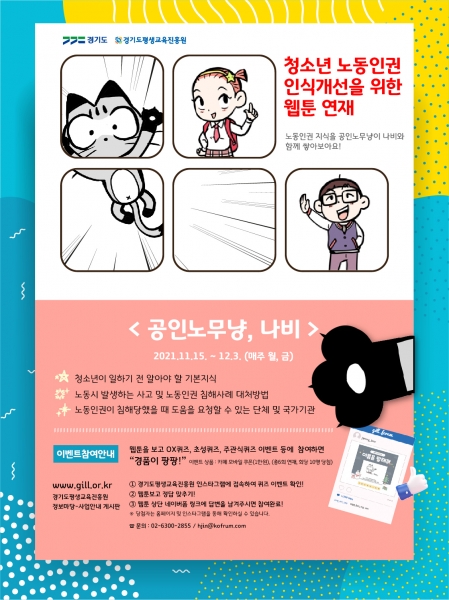 [충청뉴스큐] 경기도평생교육진흥원이 15일부터 청소년 노동인권 인식개선을 위한 웹툰 ‘공인노무냥, 나비’를 6회에 걸쳐 연재한다.