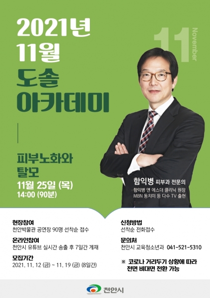 [충청뉴스큐] 천안시가 오는 25일 오후 2시 함익병 피부과전문의를 초청해 천안 박물관 공연장과 유튜브에서 11월 도솔아카데미 강연을 진행한다.