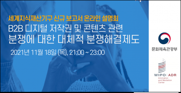 [충청뉴스큐] 문화체육관광부는 세계지식재산기구와 함께 오는 11월 18일 오후 9시 ‘기업 간 디지털 저작권·콘텐츠 분쟁 관련 대체적 분쟁해결제도 활용 현황 조사’ 연구 결과 발표회를 온라인으로 개최한다.