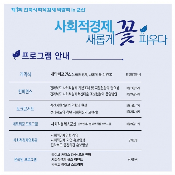 전라북도에서 처음 개최되는 이번 박람회는 ‘사회적경제, 새롭게 꽃 피우다’라는 슬로건으로 전시·판매·홍보·체험, 토크콘서트, 사회적경제 영화상영 등 오프라인 프로그램이 진행된다.