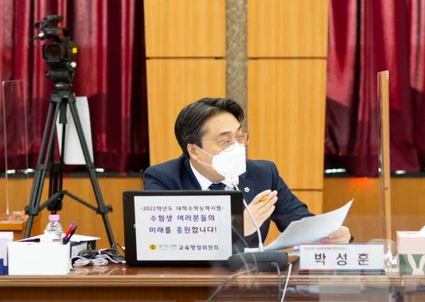 [충청뉴스큐] 경기도의회 교육행정위원회 박성훈 의원은 16일 경기도교육청 남부청사에서 열린 2021년 행정사무감사에서 전국 교육청 중 최초로 설립되는 출연기관인 ‘교육시설안전원’에 대해 질의하며 “처음이니 만큼 굉장히 신중한 접근이 필요하다”고 주문하며 “의회와도 긴밀한 협의를 진행해야 한다고” 당부했다.