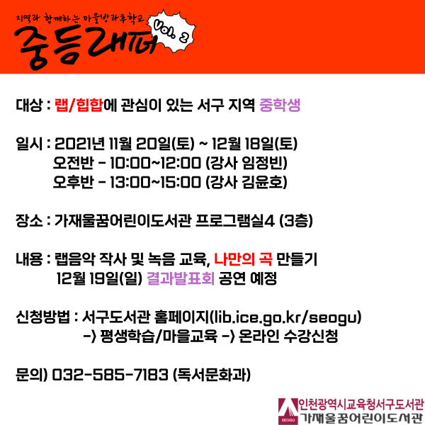 [충청뉴스큐] 인천광역시교육청서구도서관은 오는 11월 20일부터 ‘2021년 지역과 함께하는 마을방과후학교 – 중등래퍼 2기’를 운영한다.