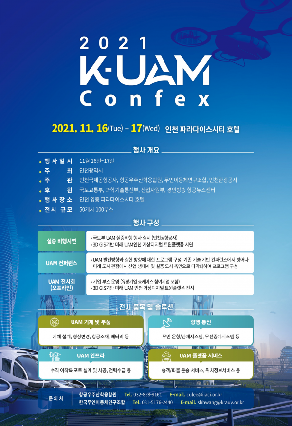 [충청뉴스큐] 인천광역시는 11월 16일부터 17일까지 영종도 파라다이스시티 호텔에서 “2021 K-UAM Confex”를 개최한다고 밝혔다.
