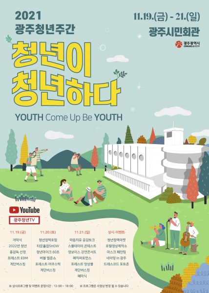 2021 광주청년주간 주요 프로그램은 유튜브 채널 ’광주청년TV“로 실시간 방송되며 행사에 대한 자세한 정보와 참여방법은 광주청년주간 홈페이지에서 확인할 수 있다.