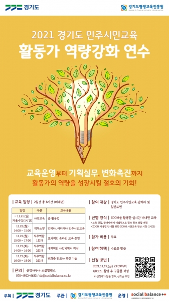 [충청뉴스큐] 경기도와 경기도평생교육진흥원이 오는 11월 22일과 23일 이틀간 도내 민주시민교육 활동가들의 역량 강화를 위한 온라인 연수를 진행한다.