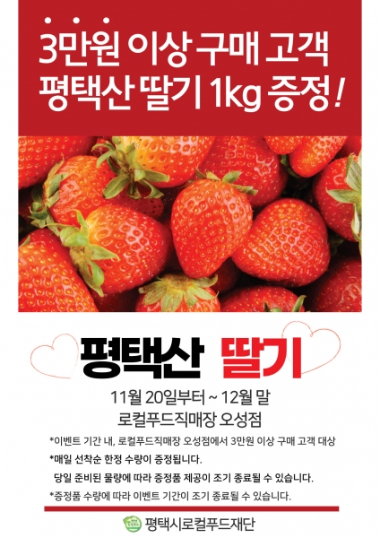 [충청뉴스큐] 평택시로컬푸드재단이 직영하는 로컬푸드직매장 오성점은 이달 20일부터 연말까지 직매장에서 3만원 이상 구매한 고객들에게 딸기를 제공하는 이벤트를 펼친다.