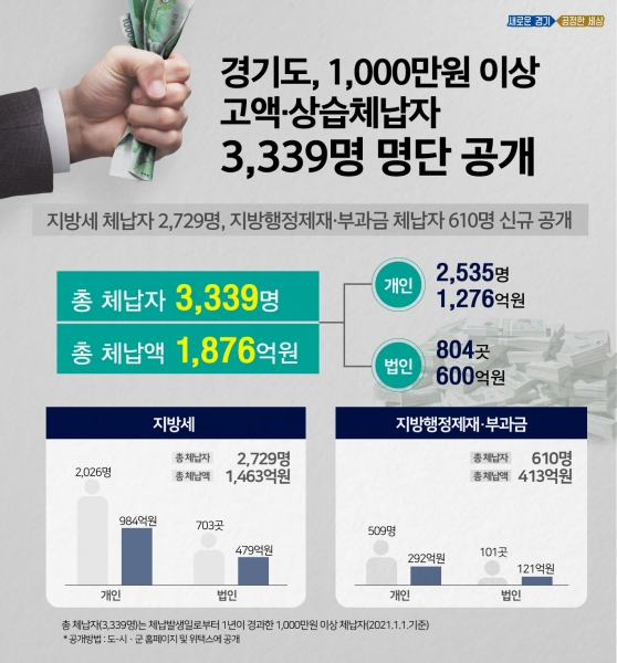 [충청뉴스큐] 경기도가 1년이 지나도록 1,000만원 이상의 세금을 내지 않은 지방세, 지방행정제재·부과금 고액·상습 체납자 3,339명의 명단을 17일 경기도 홈페이지와 위택스에 공개했다.
