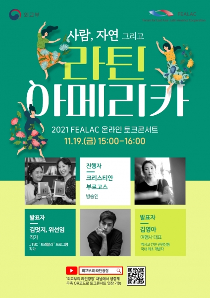 [충청뉴스큐] 외교부는 동아시아-라틴아메리카 협력포럼 협력사업의 일환으로 오는 19일‘사람, 자연 그리고 라틴아메리카’ 온라인 토크콘서트를 개최한다.