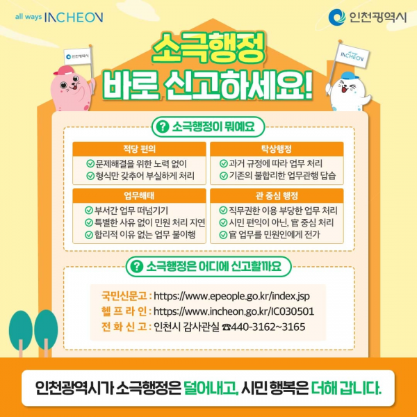 이에 인천시는 공직자의 소극행정으로 인한 시민들의 불편 해소를 위해 시 감사관실에 ‘소극행정 신고센터’를 설치해 운영할 예정이다.