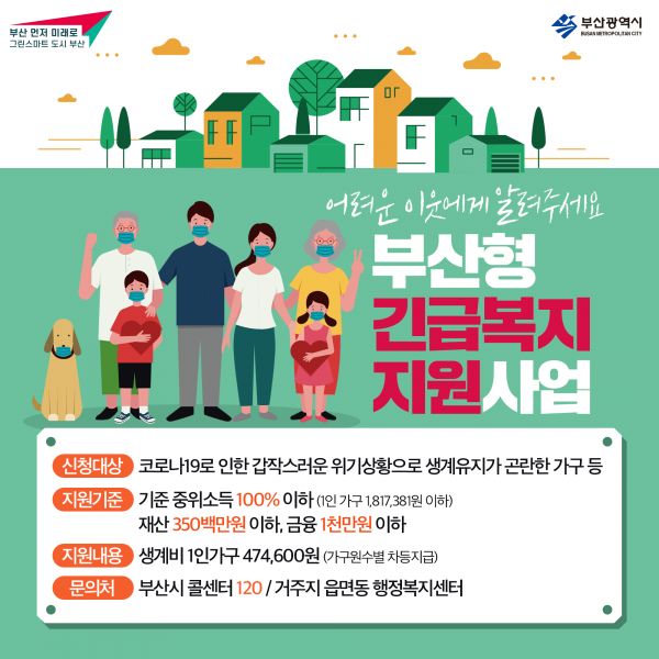 조영태 부산시 사회복지국장은 “코로나19로 어려움을 겪었으나 법정 지원을 받지 못하는 저소득 위기가구가 소외되지 않도록 신속하게 생계비를 지원하고 겨울철이 다가오는 만큼 복지 사각지대 해소를 위해 적극 나설 예정”이라며 “시민 여러분들께서도 위기 상황에 놓인 이웃을 발견하실 경우, 즉각 가까운 행정복지센터로 알려주시기를 바란다”고 전했다.