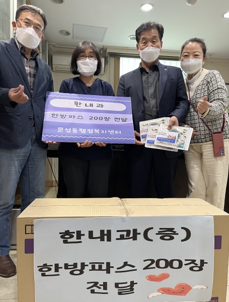 [충청뉴스큐] 천안시 문성동은 한내과가 지난 18일 주민들을 위해 한방파스 200장을 후원했다고 밝혔다.