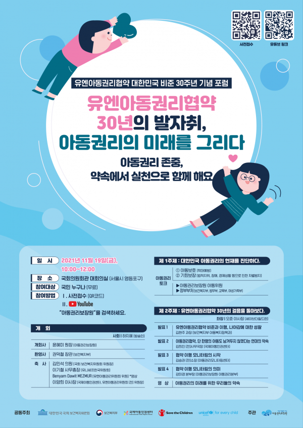 [충청뉴스큐] 보건복지부는 우리나라가 아동의 권리에 관한 가장 보편적인 국제협약인 ‘UN 아동권리협약’을 비준한지 30주년이 되는 해를 맞아, 보건복지위원회·국제아동인권센터·세이브더칠드런·유니세프 한국위원회와 공동주최하고 아동권리보장원이 주관해 11월 19일 오전 10시 서울 영등포구 국회 의원회관 대회의실에서 ‘UN 아동권리협약 대한민국 비준 30주년 기념 포럼’을 개최했다.