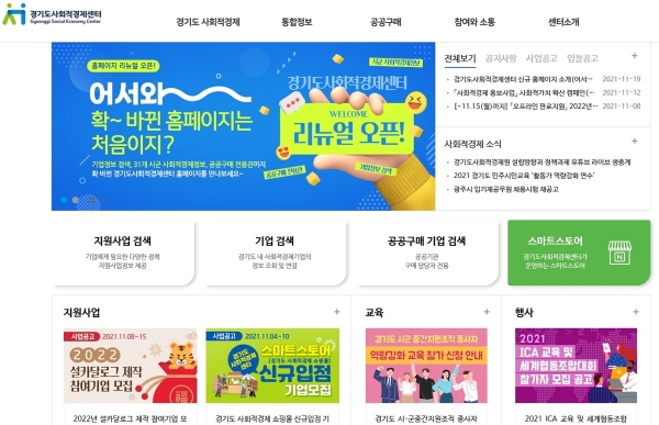 이번 홈페이지 개편은 공공구매 전용관 신설 사회적경제기업 및 지원사업 현황보기 31개 시·군별 사회적경제 정보 제공 등에 중점을 두어 경기도사회적경제 활용도을 높이고자 했다.