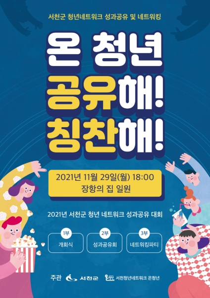 이번 성과공유회 ‘온청년 공유해 칭찬해’는 서천군 청년네트워크 5개 분과와 8개 동아리팀의 올해 활동성과를 공유 및 평가하고 내년도 활동 방향을 모색하는 행사이다.
