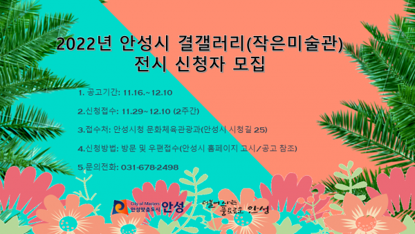 [충청뉴스큐] 안성시는 11월 29일부터 12월 10일까지 안성천변에 위치한 우리동네 작은미술관 ‘결 갤러리’에서 전시를 원하는 지역예술인의 신청 접수를 받는다고 밝혔다.