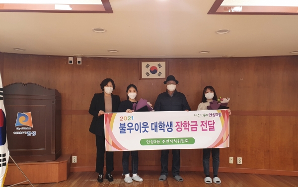 [충청뉴스큐] 안성시 안성3동주민자치위원회는 지난 18일 대학수학능력시험을 맞이해 어려운 환경 속에서도 학업에 충실한 관내 대학생 3명에게 50만원씩 총 150만원의 사랑의 장학금을 전달했다.