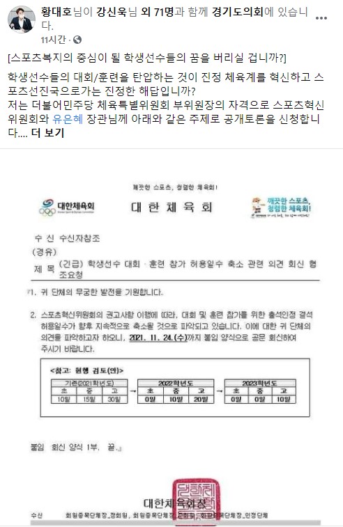 [충청뉴스큐] 경기도의회 교육행정위원회 황대호 의원이 23일 SNS를 통해 스포츠혁신위원회가 제시한 '학생선수 대회·훈련 참가 허용일수 축소 권고'에 강한 유감을 표하며 유은혜 사회부총리 겸 교육부 장관과 스포츠혁신위원회를 대상으로 공개토론을 요청했다.