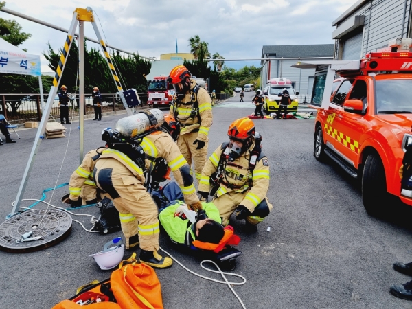 2단계는 ‘제주하수처리장 내 화재 및 가스유출 의심사고’ 발생 훈련으로 자위소방대 운영 및 초기 화재진압과 화상·연기흡입·가스노출 의심 환자를 구조하는 노하우가 전달됐다.